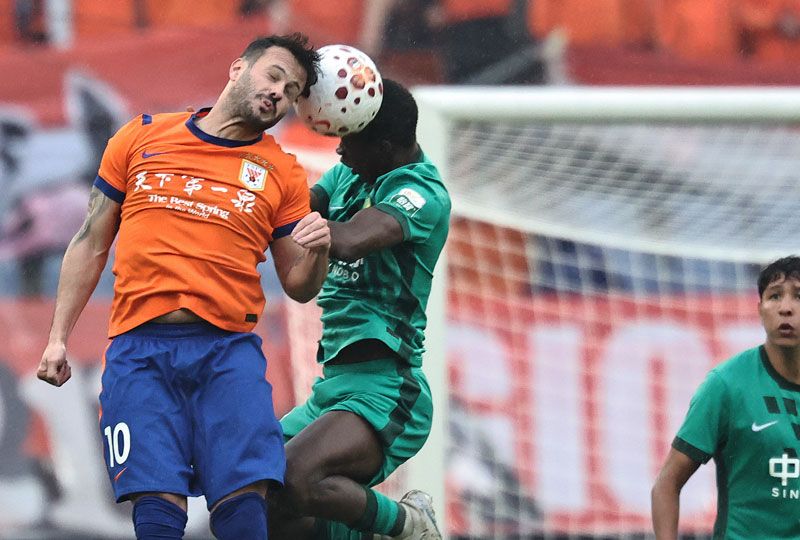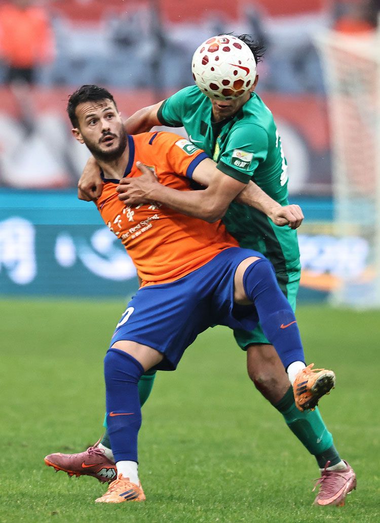 北京国安队8号孔特(右)与泰山队10号卡扎伊什维利争顶头球。刘占崑/摄