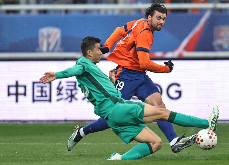 北京国安队27号王刚(左)奋力铲球破坏对方进攻。刘占崑/摄