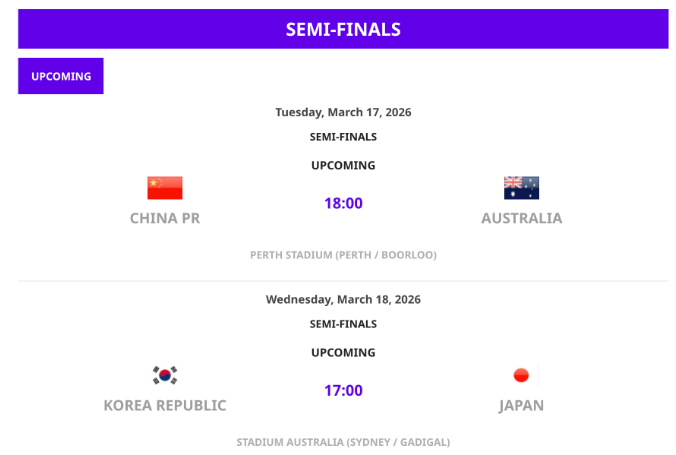 北京时间3月15日, 2026亚足联女足亚洲杯两场半决赛对阵出炉,此前2-0战胜中国台北女足的中国女足,将于北京时间3月17日18点对阵东道主澳大利亚。另一场半决赛由韩国女足对阵日本女足。两场比赛的胜者将在3月21日会师决赛。