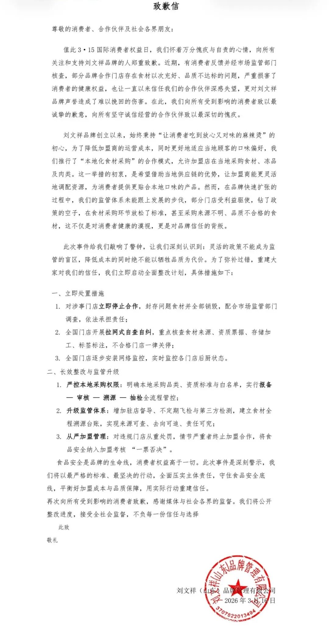 3月16日,刘文祥麻辣烫发布致歉信,其中提到整改措施:
