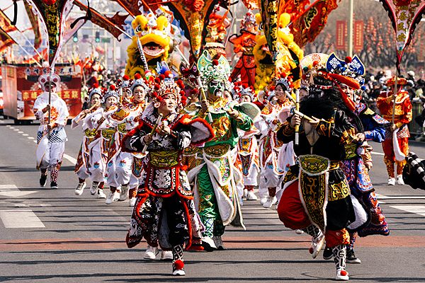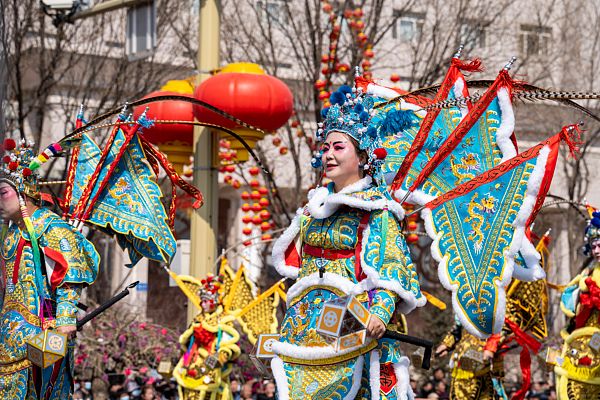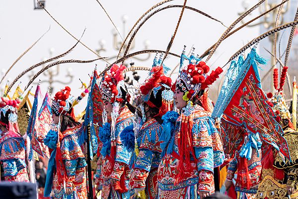 2026年3月21日,内蒙古赤峰,高跷非遗巡演举行,来自八省区的36支高跷队伍和广东英歌舞团队参加巡演。