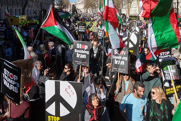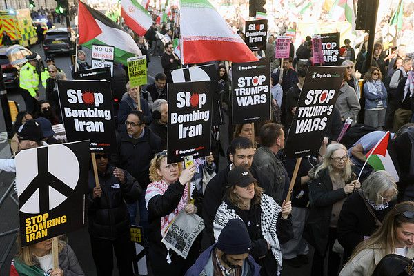 当地时间2026年3月21日,大批示威者聚集在英国伦敦市中心罗素广场,抗议美以对伊朗军事打击。示威者随后向英国多个政府机关所在地白厅进发,并在白厅举行集会。