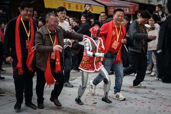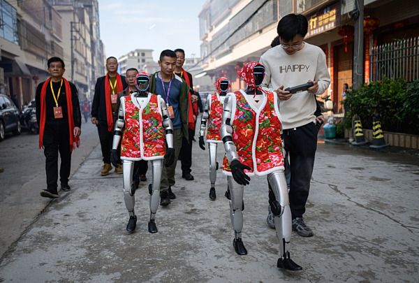 2026年3月22日,广东揭阳,人形机器人身着彩色服饰参与“营老爷”活动。随着人形机器人的普及,越来越多的机器人开始融入人们的生活。