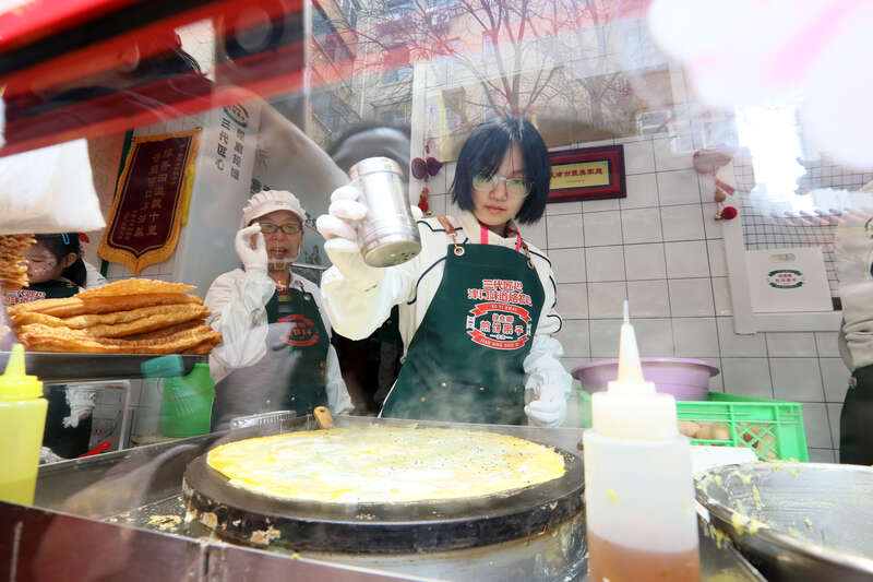 孩子学习制作传统美食煎饼果子。天津市少年儿童活动中心供图