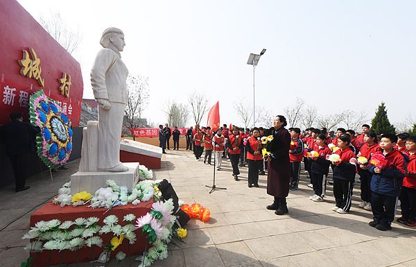 2026年4月3日,石家庄,在新乐市岸城村梁振英烈士雕像前,东阳学校少先队员和老师参加缅怀英烈活动。