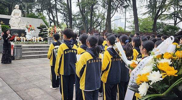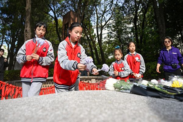 2026年4月3日,昆明,学生向烈士墓敬献纸花。清明节将至,600余名社会各界人士齐聚位于昆明的云南师范大学,在西南联大旧址的“一二・一”运动四烈士墓前举行“清明祭英烈”活动,致敬忠魂,传承西南联大精神。 中新社记者 李嘉娴 摄