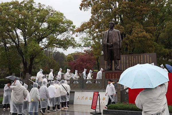2026年4月3日,江西南昌,清明节前夕,在江西省南昌市方志敏烈士纪念园,民众瞻仰烈士墓,敬献菊花,参观烈士事迹陈列室,了解方志敏的光辉事迹,深切缅怀革命先烈。图为民众冒雨在方志敏烈士铜像前敬献鲜花。 中新社记者 刘占昆 摄