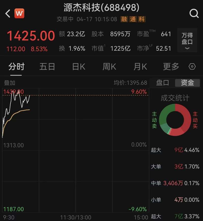 中新网4月17日电(记者 谢艺观)4月17日,源杰科技持续走强,盘中股价突破1410元,超越贵州茅台成为A股新“股王”。公开资料显示,源杰科技是一家从半导体晶体生长,晶圆工艺,芯片测试与封装全部开发完毕,并形成工业化规模生产的高科技企业。