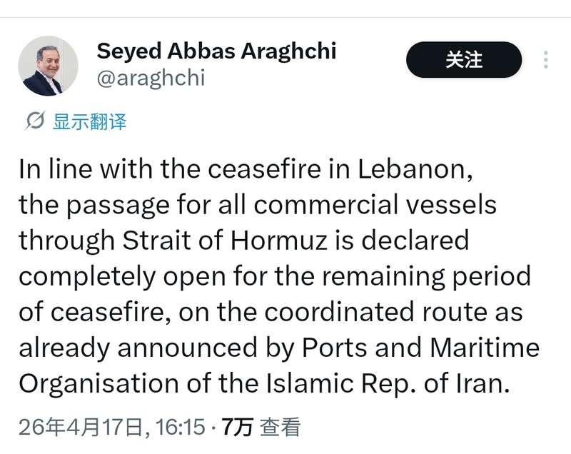 当地时间17日下午,伊朗外长阿拉格齐在社交媒体发文称,鉴于黎巴嫩和以色列达成停火,在停火期间,伊朗对所有商船开放霍尔木兹海峡。