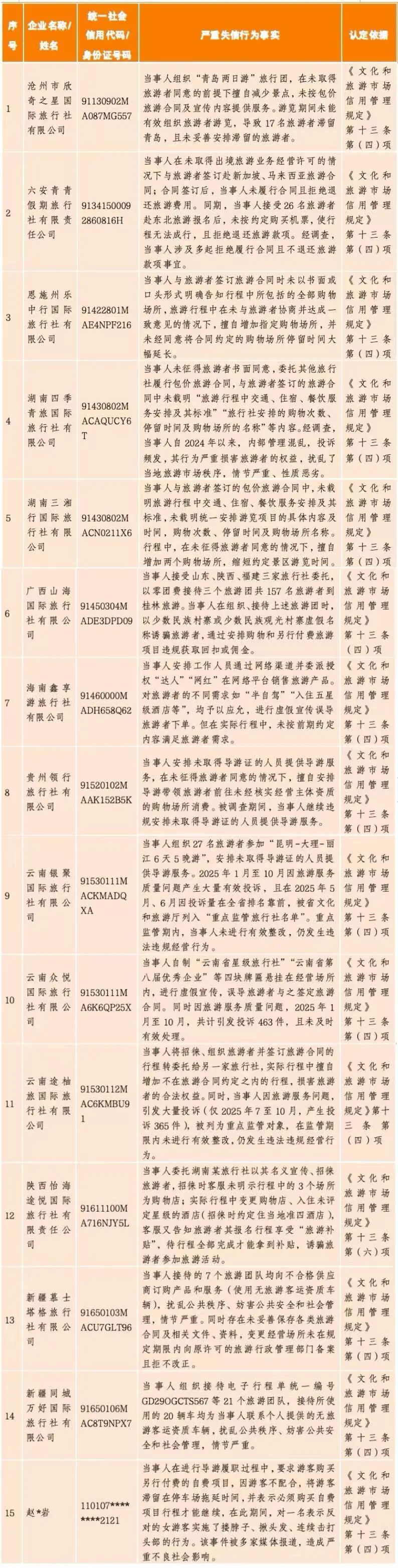 旅游市场秩序集中整治严重失信主体典型名单(2026年第一批)公布