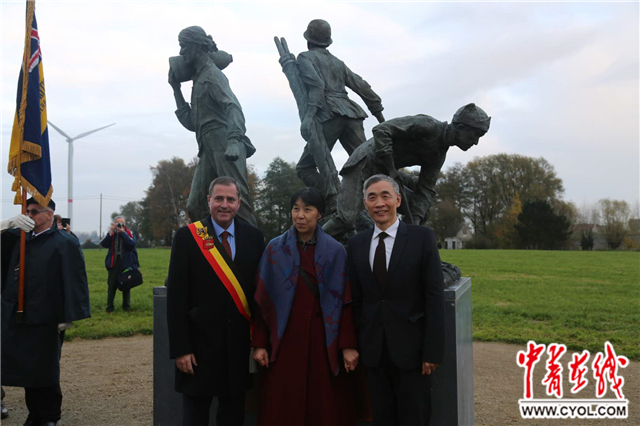 11月15日,中国驻比利时大使曲星、比利时波普林格市长德雅盖与比利时华裔雕塑家闫淑芬在一战华工雕像前合影。鞠辉/摄