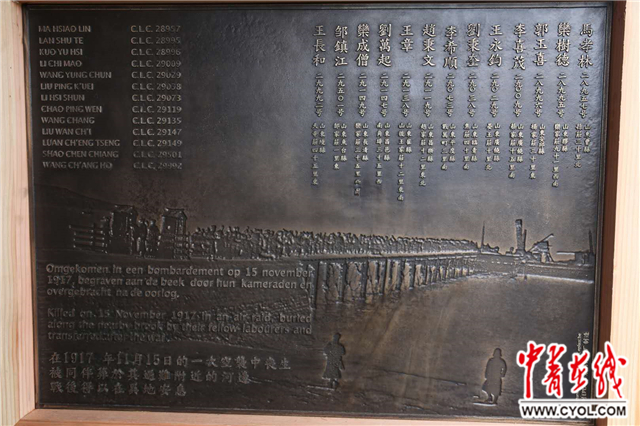 1917年11月15日,德军空袭比利时波普林格市布思本村,13名正在附近营地工作的华工不幸被炸身亡。图为悬挂在在布思本轰炸遗址的标有阵亡华工姓名的铜匾。鞠辉/摄