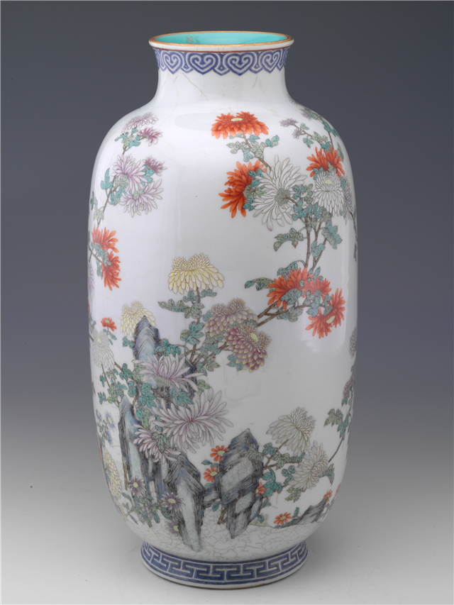 四是陶风瓷韵。精美的瓷器一向是收藏家最心仪的收藏门类之一,也是章乃器收藏的大项。本展览展出的明宣德青花缠枝花卉盘、清康熙青花加紫山水笔筒、清乾隆粉彩菊花灯笼尊、霁红盘、霁蓝盘等,均为其中的精品。
