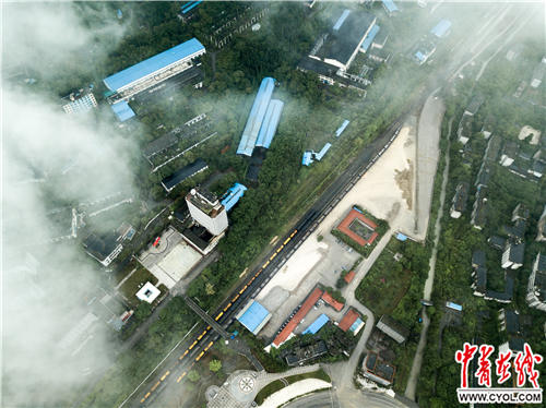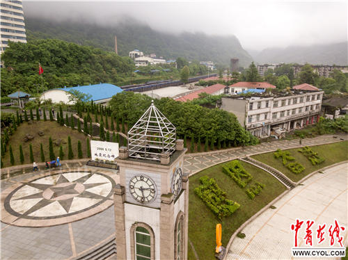 2018年5月9日,航拍钟楼背后的汉旺火车站。(汪龙华 摄)