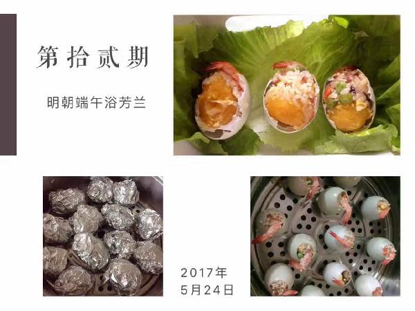 在2017年学生备战高考的最后3个月,王若聪坚持每周三语文早自习给4位同学做不同的诗意早自习便当。清明节,刚好学生们要参加浙江新高考改革的选考,王若聪做了鲤鱼样式的青团,取名“龙湖倚梦跃青鲤”;端午节,她结合糯米和鸭蛋做了“虾扯蛋”,取名“明朝端午浴芳兰”……高考前,班里的每个同学都收到了一份“私人定制”的便当。