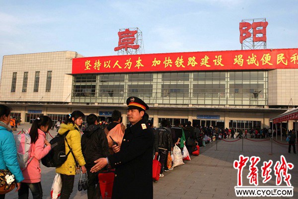 2010年,阜阳站客运人员在春运现场引导旅客有序进站上车。陆应果 摄