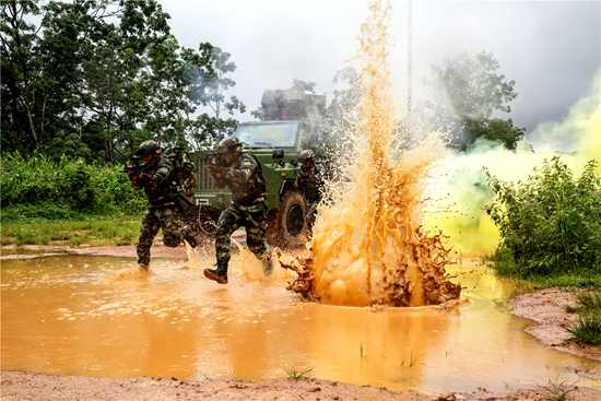 反恐演练中,一中队官兵冒着炮火快速突击。